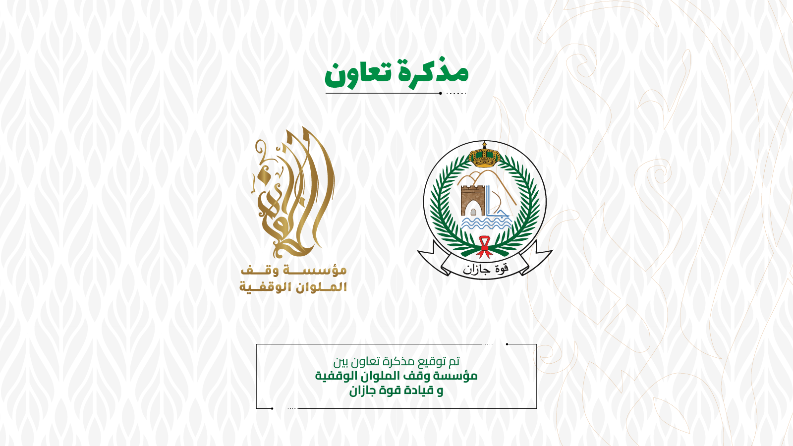 ضمن برنامج الكفالات، وقعت مؤسسة وقف الملوان الوقفية، عقد تعاون مشترك مع جمعية عطف للأيتام بمنطقة جازان، لدعم مشروع كفالة الأيتام من مستفيدي الجمعية.