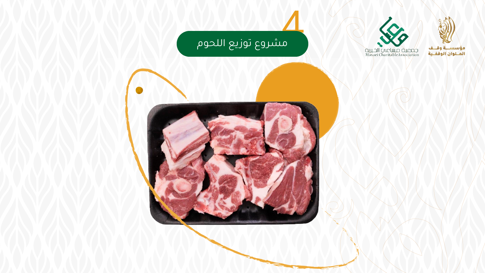 ضمن برنامج الأمن الغذائي، وقعت مؤسسة وقف الملوان الوقفية، عقد تعاون مشترك مع جمعية مساعي الخيرية بالرياض، لتنفيذ المرحلة الرابعة من مشروع توزيع اللحوم على الأسر المحتاجة من مستفيدي الجمعية. تم بحمد الله توزيع ١٤ رأس غنم على ٣١ أسرة من الأسر الأشد حاجة