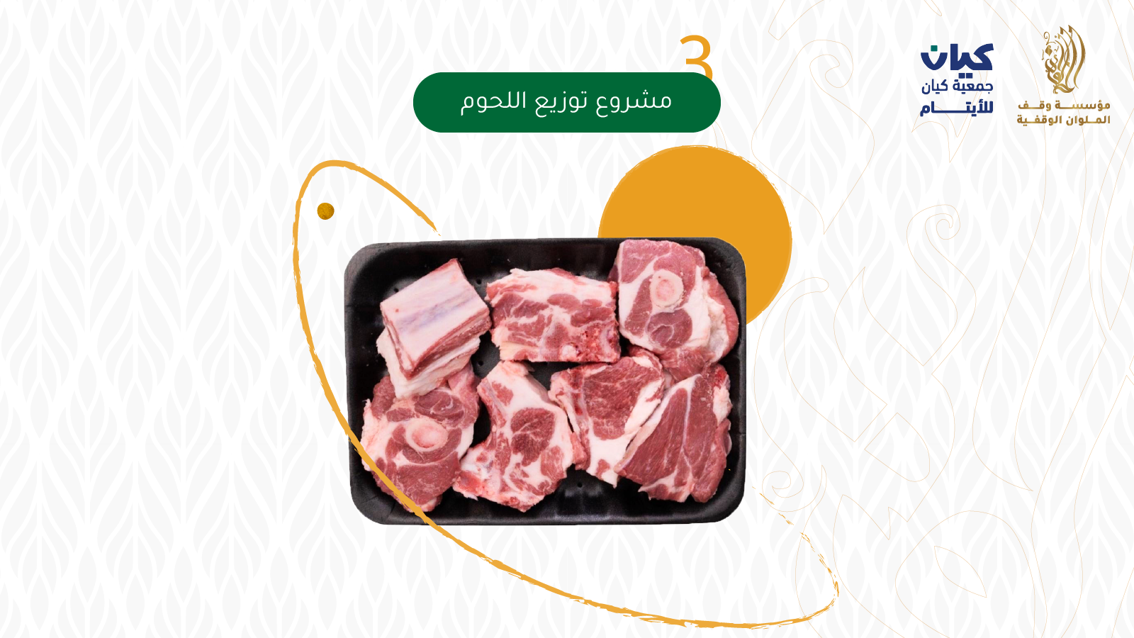 ضمن برنامج الأمن الغذائي ، وقعت مؤسسة وقف الملوان الوقفية عقد تعاون مشترك مع جمعية كيان للأيتام في الرياض، لتنفيذ مشروع توزيع اللحوم في مرحلته الثالثة للأسر من مستفيدي الجمعية.